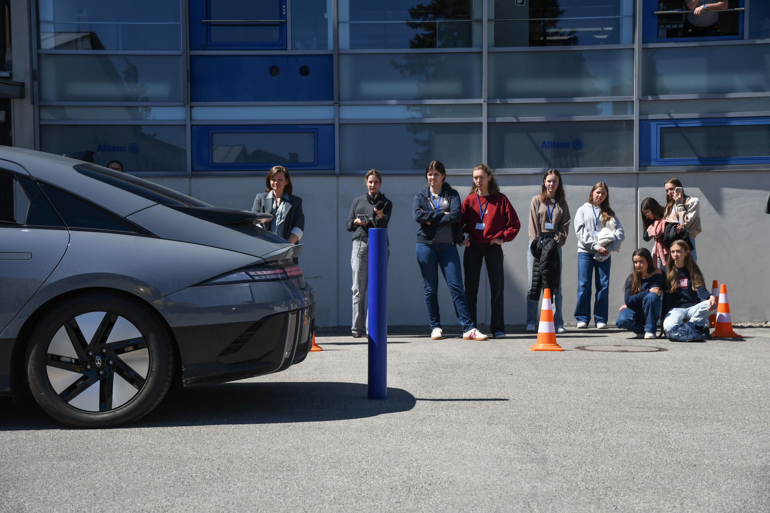 Antworten darauf und viel mehr bekamen unsere 20 Teilnehmerinnen im Austausch mit unseren Kolleginnen Stefanie van den Bergh (zweite Geschäftsführerin des AZT), Olivia Reinicke (Assistentin von Frank Sommerfeld, Vorstandsvorsitzender Allianz Versicherungs-AG), Melanie Ostermeier (Expertin für Fahrzeuglackierung), Natallia Dziamchuk (Expertin für Fahrzeug-IT-Sicherheit) und Melanie Kreutner (Leiterin der Crashanlage) und nicht zuletzt unseren Werkstudentinnen. Es wurden Lebensläufe und Träume diskutiert, Fahrzeugteile lackiert, Einblicke in die Fahrzeug-IT-Sicherheit gewonnen, das AZT mit all seinen Facetten erkundet, die Dummies auf der Crash-Bahn besucht und live erlebt, was moderne Fahrzeuge heute alles können.